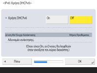 Πατήστε <On> για τη χρήση DHCPv6 ή <Off> για τη μη χρήση DHCPv6 και, στη συνέχεια, πατήστε <OK>.