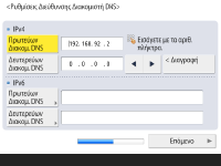Πατήστε <Πρωτεύων Διακομ. DNS> και <Δευτερεύων Διακομ. DNS>, εισαγάγετε τη διεύθυνση IPv4/IPv6 για τον διακομιστή DNS και, στη συνέχεια, πατήστε <Επόμενο>.