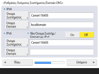 Εάν οι ρυθμίσεις των διευθύνσεων IPv4 και IPv6 είναι οι ίδιες, πατήστε <On> στο <Ίδιο Όνομα Συστήμ./Domain με IPv4>.