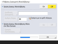 Εάν δεν χρησιμοποιείτε πιστοποίηση χρήστη, πατήστε <Off> στο <Χρήση Πιστοποίησης Χρήστη>, πατήστε <OK> και μεταβείτε στο βήμα 5.