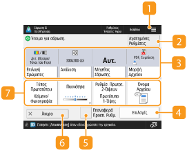 Όταν πατήσετε <Σάρωση & Αποθήκευση> στην οθόνη <Αρχική σελίδα>, και έπειτα πατήσετε <Δίκτυο> ή <Μέσο Μνήμης> για να σαρώσετε τα πρωτότυπα, εμφανίζεται η ακόλουθη οθόνη ρυθμίσεων.