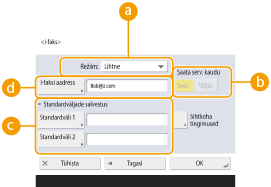 Kui kasutatav domeen on fikseeritud, võite jätta domeeni sisestamise vahele. Võite eelnevalt salvestada domeeninime menüüs <Määr. domeeni aut. lisamine domeenita sihtkohtadele> ja lubada seade <E-posti saatmisel>, et lisada saatmisel automaatselt domeeni ilma, et oleks vaja sisestada „@” ja domeeninimi.