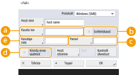 ja parool kuval . Lisateavet leiate teemast „<Faili SA / brausimise autentimiseks kasutatav info>“.Kui valite seade <Protokoll> jaoks <Windows (SMB)> või <FTP> ja määrate kausta, mida pole olemas seades <Kausta tee>, luuakse see kaust automaatselt ja failid salvestatakse sellesse. Kui määrate mitme tasandiga kausta, tekib saatmistõrge.