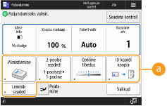 Valikus <Lemmikseaded> salvestamineSaate valikus <Lemmikseaded> registreerida kopeerimisel sagedasti kasutatavaid toiminguid ja ka skannimisel sagedasti määratud asukohti ja seadeid. Lisateavet leiate teemast „Sageli kasutatavate funktsioonide kombinatsiooni salvestamine”.