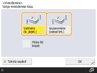<Töö koostamine>, saate kasutada sortimise/grupeerimise funktsiooni isegi siis, kui originaal on asetatud skannimisklaasile.Gruppväljundile iga lehe vahele töö eraldaja asetamineKui valite <Grupeerimine (samad lehed)>, saate sisestada töö eraldaja iga grupi vahele. Lisateavet vt <Töö eraldaja gruppide vahel>. <Töö eraldaja gruppide vahel>