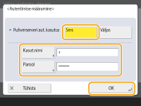 Puhverserveri autentimisfunktsiooni kasutamiseks vajutage sellel valikul ja konfigureerige autentimisteave. Vajutage kuvataval ekraanil valikut <Sees>, sisestage puhverserveris tuvastamiseks kasutatav kasutajanimi ja parool ning vajutage <OK>.