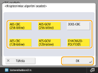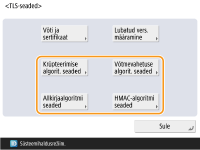 Kui määrate funktsiooni <Vormindamise krüpteerimise meetodiks FIPS 140> olekuks <Sees>, saate kasutada USA valitsuse heakskiidetud standardile FIPS (Federal Information Processing Standards) 140-2 vastavat TLS-sidekrüptimismeetodit. <Vormindamise krüpteerimise meetodiks FIPS 140>