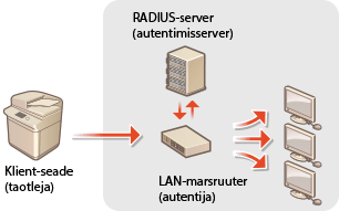 Kui printer püüab luua ühenduse ja alustada sidet mõne 802.1X võrguga, peab printer läbima kasutajate autentimise tõestamaks, et ühenduse looja on volitatud kasutaja. Autentimisteave saadetakse RADIUS-serverisse, mis seda kontrollib ning olenevalt autentimise tulemusest lubab või keelab sideühenduse võrguga. Kui autentimine nurjub, blokeerib kohtvõrgulüliti (või pääsupunkt) juurdepääsu võrku väljastpoolt. Seadme saab ühendada 802.1X-võrku klientseadmena.