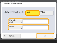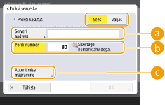 Vajutage seda autentimise info seadmiseks, kui kasut. puhverserveri autentimise funktsiooni. Vajutage kuvatud ekraanil <Sees>, sisestage puhverserveri autentimiseks kasutajanimi ja parool ning vajutage <OK>.