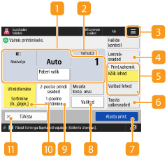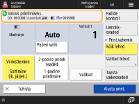 Kuvab sätte oleku (nt prinditav paberiformaat ja prinditavate lehekülgede arv). Kontrollige, kas seaded on õigesti printimiseks kinnitatud. Seadete muutmiseks vajutage näidikujaotise all olevat nuppu. Printimiste arvu muutmiseks sisestage number numbriklahvide abil.