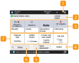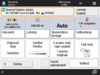 Kui vajutate <Skaneeri ja salvesta> kuval <Avamenüü> ja seejärel vajutate <Võrk> või <Infokandja (mälu)> originaalide skannimiseks, kuvatakse järgmine seadistuskuva.