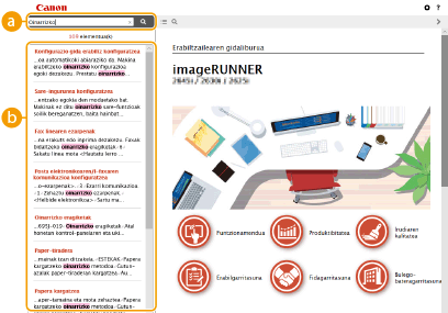 bilaketa-pantaila bistaratzeko. Gakoen bidezko bilaketak burutzeko testu-lauki bat dauka, bilatzen ari zaren orrialdea aurkitzeko.