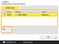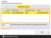 (Gelditu) sakatzen baduzu kontrol-panelean bidalitako/inprimatutako lan bat prozesatzen ari denean eta <Bidali lanak>/<Inprimatze-lanak>-era bideratzen duen pantaila bistaratzen denean, aribidean dagoen bidalitako/inprimatutako lana pausatu egingo da eta <Bidali lanak>/<Inprimatze-lanak> agertuko da.