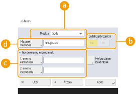 Erregistratu egin dezakezu hartzailearen fax-zenbakia edo helbide elektronikoa, zeina erabil daitekeen eskaneatutako dokumentuak bidaltzean helbide-liburuan. Horretaz gain, erregistratu egin dezakezu I-Fax helmuga, fitxategiaren zerbitzariaren karpetaren kokalekua (IP helbidea eta bide-izena) eta funtzio anitzeko Canon inprimagailuaren biltegiratzea (Eremu aurreratua) helbide-liburuan helmuga gisa.