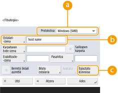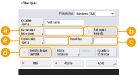 ) eta honako pasahitza: ( ) ez den autentifikazio-informazioa erabil dezakezu. Argibide gehiago eskuratzeko, ikusi <Fitxategi TX/arakatzea autentifikatzeko info.>.<Protokoloa> ezartzen baduzu <Windows (SMB)> edo <FTP>-rako, <Karpetaren bide-izena>-(e)n existitzen ez den karpeta bat zehaztuz, karpeta automatikoki sortuko da eta bertan gordeko dira fitxategiak. Hala ere, bidaltze-errorea gertatuko da maila anitzeko karpeta zehaztuz gero.