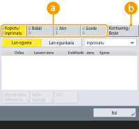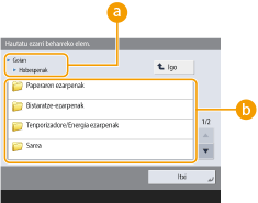(Ezarp./Gorde) <Ezarpenak/Gordetzea> pantaila bistaratzeko. Lehenik, sakatu tekla hori ezarpen bakoitzean aldaketak egiteko; hala nola, paper-ezarpenak, pantaila-ezarpenak, eta sare-ezarpenak. Pantaila honetan, helmugak ere erregistra ditzakezu; hala nola, helbide elektronikoak eta fax-zenbakiak.