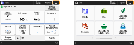 (Hasiera) sakatuz, <Etxea> pantaila bistaratzen da. <Etxea> pantailak funtzio-botoi eta ekintzen zerrenda erakusten du sarrera gisa hainbat funtziotarako. Elementu bistaratuta <Etxea> pantailan