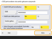 Sakatu <SSID pertsonalaren eta sareko gakoaren ezarpenak>, zehaztu SSID pertsonala eta sare-gakoa eta sakatu <Ados>.