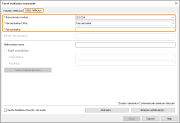 Klikatu [Idatzi helburua] tabuladorea eta zehaztu erabiltzen duzun komunikazio modua eta fax zenbakia.
