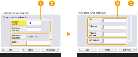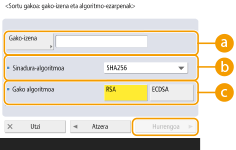 (Ezarp./Gorde) <Kudeaketa-ezarpenak> <Gailuaren kudeaketa> <Ziurtagiriaren ezarpenak> <Gakoa eta ziurtagirizerrenda> sakatuz bistaratzen den pantailan. Gakoen eta ziurtagirien zerrenda ez bada bistaratzen, sakatu <Gailu hon gako- eta ziurtagiri-zerrenda> bistaratzeko.Gako eta ziurtagiri bat hautatzen badituzu eta <Ziurtagiriaren xehetasunak> sakatzen baduzu, ziurtagiriaren inguruko informazio xehatua bistaratuko da. Orri horretan, <Egiazt. ziurt.> ere sakatu dezakezu ziurtagiria baliozkoa den egiaztatzeko.