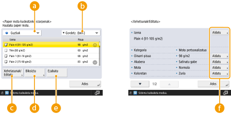 Paper-mota pertsonalizatuaren ezarpenak erregistratzean, aldatu iezaiozu izena. Makinan erregistratutako paper-mota lehenetsien ezarpenak ezin dituzu aldatu.
