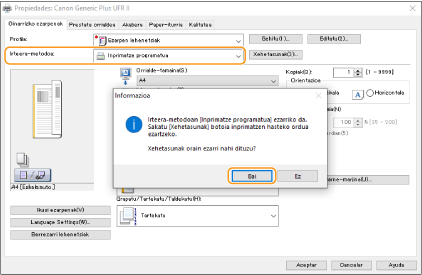 Hautatu [Inprimatze programatua] [Irteera metodoa]-en eta sakatu [Bai].