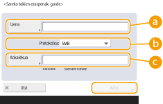 Protokolo-ezarpenean, <Lekua> bistaratzen da <SMB> hautatzerakoan eta <Ostalari-izena> bistaratzen da <WebDAV> hautatzerakoan.