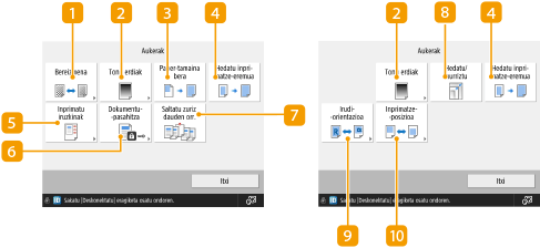 Ezarpenen egoera bistaratzen du, adibidez, inprimatzeko paper-tamaina eta kopia kopurua. Ziurtatu ezarpenak baieztatu dituzula behar bezala inprimatzeko. Ezarpenak aldatzeko, sakatu bistaratze-sekzioaren azpiko botoia. Kopia kopurua aldatzeko, sartu kopurua zenbaki-teklak erabiliz.