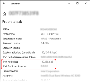 [Properties] atalean, ikusi IP helbidea eta DNS zerbitzaria.