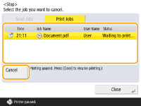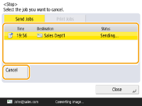 اگر وقتی کار ارسال/چاپ در حال پردازش است و صفحه‌ای که به <Send Jobs>‏/<Print Jobs‎> منتهی می‌شود در حال نمایش باشد، (توقف) را در صفحه کنترل فشار دهید، کار ارسال/چاپ در جریان موقتاً متوقف می‌شود و <Send Jobs‎>‏/<Print Jobs‎> نمایش داده می‌شود.