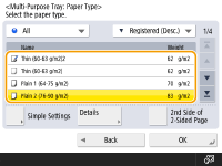نوع کاغذ پاکت نامه را نمی توان از صفحه جزئیات <Paper Type> انتخاب کرد. برای انتخاب نوع کاغذ پاکت نامه، نوع کاغذ را در <Register Favorite Paper (Multi-Purpose Tray)> ثبت کنید، سپس <Favorite Paper> را در مرحله 2 فشار دهید