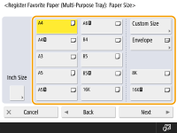 اگر گزینه <Always Specify> در بخش <Multi-Purpose Tray Defaults> روی <Favorite Paper> تنظیم شده باشد، هنگام بارگذاری کاغذ در سینی چندمنظوره، صفحه ای نشان داده می شود که به شما اجازه می دهد "کاغذ مورد علاقه" را انتخاب کنید. <Multi-Purpose Tray Defaults>
