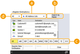 اگر می‌خواهید مقصدهای زیادی ثبت کنید، یا می‌خواهید آنها را براساس بخش یا شرکای تجاری طبقه‌بندی کنید، آنها را در Address Book ثبت کنید. Address Book به شما امکان می‌دهد با استفاده از اولین نویسه از نام یا با انتخاب نوع مقصد مانند فاکس یا ایمیل، مقصد را جستجو کنید. می‌توانید مقصدهایی برای همه کاربران و مقصدهایی برای استفاده خودتان ثبت کنید و همچنین مقصدهایی ثبت کنید که فقط سرپرست بتواند آن‌ها را ویرایش کند. ثبت مقصد در Address Book