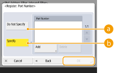 تنظیم آدرس استثنا فقط برای ارتباط دریافتی از آدرس IP مشخص شده با استفاده از شماره درگاه اختصاص داده شده اعمال می‌شود. <Add> را فشار دهید، شماره درگاه را وارد کنید و <OK> را فشار دهید. می‌توانید تا 50 درگاه را به ازای یک آدرس استثنایی برای هر دو IPv4/IPv6 ثبت کنید.