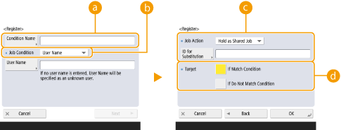 می‌توانید شرایط دقیق برای نگه داشتن کارهای چاپ مانند کاربر یا آدرس IP را تنظیم کنید. اگر هیچ شرایطی تنظیم نشده باشد، تمام کارهای چاپ به استثنای کارهای مربوط به کاربران ناشناس، نگه داشته می‌شوند. اگر هیچ شرایطی تنظیم نشده باشد و یک کار چاپ از یک کاربر ناشناس دریافت شود، این کار بدون نگه داری لغو می‌شود.