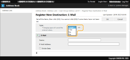 همینطور می‌توانید تنظیم کنید زمانی که نام گروه کاربری تغییر می‌کند، نام address book گروه کاربری نیز تغییر نماید. تحت عنوان یک کاربر دارای امتیازات سرپرستی به Remote UI (واسطه کاربر از راه دور) وارد شوید، [Settings/Registration]‏ [Set Destination]‏ [Personal Address List/User Group Address List Settings] را فشار دهید و سپس کادر انتخاب [Apply User Group Name Change to User Group Address List Name] را علامت بزنید. [Apply User Group Name Change to User Group Address List Name] فقط زمانی در دسترس است که مدیریت تأیید اعتبار شخصی فعال باشد.