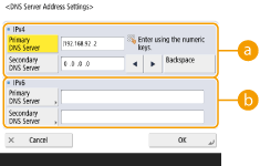 <Primary DNS Server> را فشار دهید و آدرس IPv6 سرور DNS را وارد کنید. نمیتوانید آدرسهایی که با "ff" آغاز میشوند (آدرس دهی چندپخشی)، و آدرسهایی که تنها از "0" تشکیل شده یا آدرسهای local-link را وارد کنید.