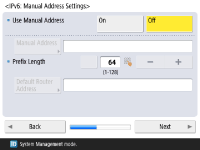 برای استفاده از آدرس دستی، <Manual Address>، <Prefix Length>، و <Default Router Address> را برای وارد کردن هر مقدار فشار دهید.