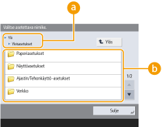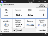 Voit muuttaa näyttöön liittyviä asetuksia, esim. mikä näyttö avautuu heti laitteen käynnistyttyä, ja näytetäänkö jäljellä olevaa paperin ja väriaineen määrää koskeva viesti. <Näyttöasetukset>