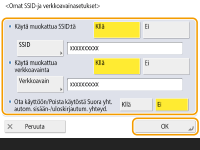 Valitse <Omat SSID- ja verkkoavainasetukset>, määritä oma SSID ja verkkoavain ja valitse <OK>.