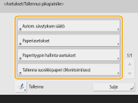 Voit helpottaa <Päävalikko>-näytön ja perustoimintojen näytön käyttöä mukauttamalla näyttöä muuttamalla painikkeiden järjestystä ja luomalla pikapainikkeita. Lisäksi voit työskennellä tehokkaammin, kun tallennat usein käytettyjä toimintoja kohtiin <Henkilökohtainen>/<Jaettu> tai henkilökohtaisiin asetuksiin ja mukautat käyttöympäristöä tarpeidesi mukaan.