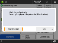 Kun <Näytä ilmoitus kun työ on hyväksytty> -asetuksena on <Kyllä>, <Tilavalvonta>-näyttö voidaan avata seuraavalla näytöllä, joka tulee esiin, kun lähetystyö vastaanotetaan. <Näytä ilmoitus kun työ on hyväksytty>