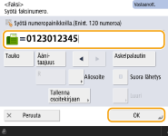 Faksien lähettäminen ulkomailleSyötä ulkomaan suuntanumero, maakoodi ja faksinumero, tässä järjestyksessä. Jos et voi muodostaa yhteyttä ulkomaiseen vastaanottajaan, lisää numeron ja seuraavan numeron väliin tauko valitsemalla <Tauko>.