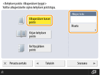 Kun lähetysvirhe tapahtuu siksi että vastaanottajan linja on varattuLaite valitsee numeron uudelleen määrätyn ajan kuluttua. Voit vaihtaa asetuksia, kuten montako kertaa laite valitsee numeron uudelleen ja uudelleenvalintojen välin. <Autom. uudelleenvalinta>