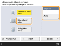 Faksien lähettäminen aliosoitteellaLaite tukee ITU-T*-standardin aliosoitteiden käyttöä. Jos vastaanottava faksilaite on yhteensopiva ITU-T aliosoitteiden kanssa, voit lähettää asiakirjoja paremmilla turvaominaisuuksilla liittämällä faksiliikennöinteihin aliosoitteen ja salasanan. Voit lähettää asiakirjan aliosoitteella kirjoittamalla faksinumeron, valitsemalla <Aliosoite> tai <Aseta tiedot> ja kirjoittamalla sitten aliosoitteen ja salasanan.