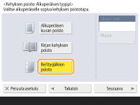 Jos <Alkuper. koko> -kohdassa näkyvä koko ei ole sama kuin alkuperäisen koko, valitse koko valitsemalla <Muuta>. Voit asettaa Alkuperäisen kehyksen poiston vain sen kokoisille alkuperäisille, jotka näkyvät kosketusnäytössä.