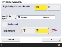 Voit tallentaa lähetetyn asiakirjan kopion lähettämällä sen skannauksen perustoimintonäytössä useille vastaanottajille, myös faksivastaanottajalle. Jotta näet faksivastaanottajan skannauksen perustoimintonäytössä, <Salli faksi skannaus- ja lähetystoiminnassa> -asetukseksi on määritettävä <Kyllä>. <Näytä faksitoiminto>