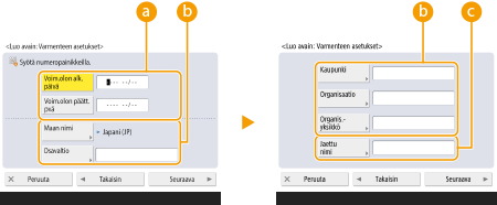 (Asetukset Rekisteröi) <Hallinta-asetukset> <Laitehallinta> <Varmenteiden asetukset> <Avain- ja varmennelista>. Jos avainten ja varmenteiden luetteloa ei näytetä, avaa se valitsemalla <Laitteen avain- ja varmennelista>.Jos