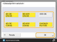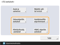 Jos määrität <Alusta salausmenetelmä FIPS 140:lle> -asetukseksi <Kyllä>, voit määrittää TLS-tiedonsiirron salausmenetelmän noudattamaan Yhdysvaltain hallituksen hyväksymää FIPS (Federal Information Processing Standards) 140 -standardia. <Alusta salausmenetelmä FIPS 140:lle>