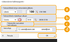 Et voi määrittää faksin käyttöraportin asetuksia, kun <Näytä työloki> -asetuksena on <Hallinta-asetukset>-kohdassa <Ei>. Jos muutat <Näytä työloki> -asetuksen <Hallinta-asetukset>-kohdassa asetuksesta <Ei> asetukseen <Kyllä>, faksin käyttöraportin <Tulosta/lähetä tietyn siirtomäärän jälkeen.>- ja <Tulosta/lähetä määrättyyn aikaan>-asetukseksi muuttuu <Ei>. <Näytä työloki>